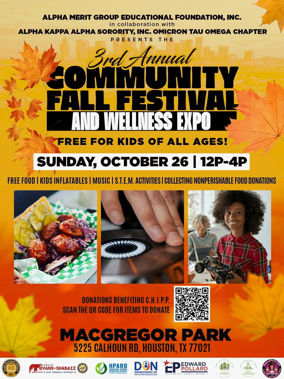 The Alpha Merit Group Educational Foundation, Inc., and Alpha Kappa Alpha Sorority, Incorporated® Omicron Tau Omega Chapter (Empower Our Families and Uplift Our Local Community Initiatives) Present the 3rd Annual Community Fall Festival & Wellness Expo, a free family-friendly event celebrating community, health, and togetherness.